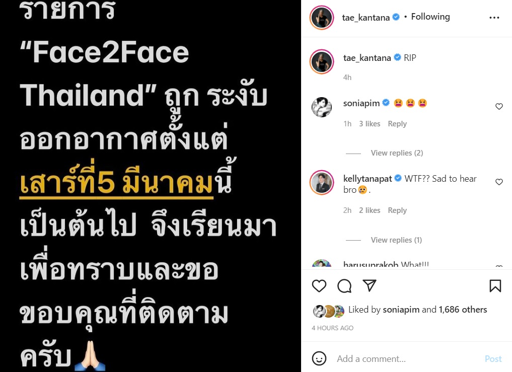 สร้างความงุนงงให้แฟนรายการ Face 2 Face Thailand ไม่น้อย เมื่อล่าสุด (2 มีนาคม 2565) เต้ กันตนา ซึ่งเป็นเจ้าของรายการและพิธีกรหลักมีการออกมาโพสต์ข้อความผ่านทางอินสตาแกรมว่า "รายการ Face 2 Face Thailand ถูกระงับออกอากาศตั้งแต่เสาร์ที่ 5 มีนาคม นี้ เป็นต้นไป จึงเรียนมาเพื่อทราบและขอขอบคุณที่ติดตามครับ" พร้อมระบุแคปชั่นสั้น ๆ ว่า "RIP"