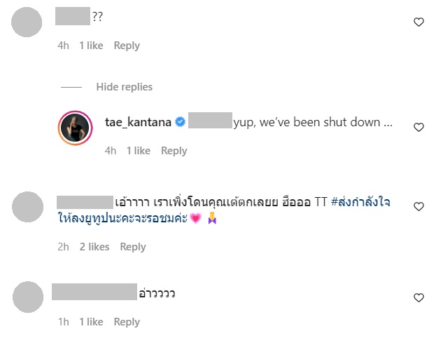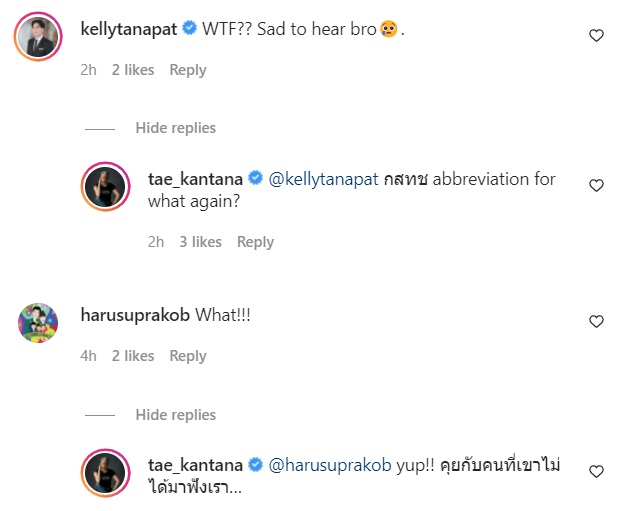 ทั้งนี้ มีหลายคนเข้ามาคอมเมนต์ถามว่าเกิดอะไรขึ้น ซึ่งคุณเต้ก็เข้ามาตอบว่า "กสทช abbreviation for what again?" ขณะที่ ฮารุ สุประกอบ เข้ามาคอมเมนต์ว่า "What !!!" คุณเต้ก็ตอบกลับไปแบบตัดพ้อว่า "yup !! คุยกับคนที่เขาไม่ได้มาฟังเรา..."