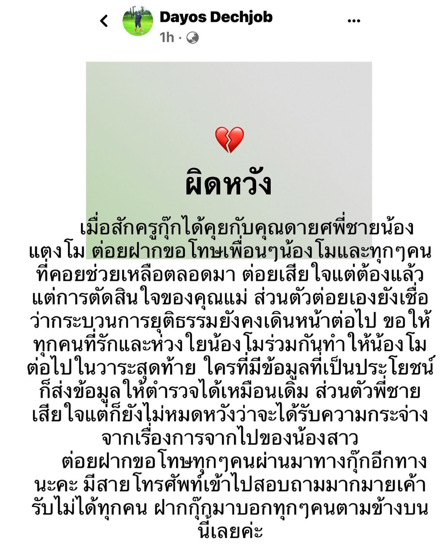 "เมื่อสักครูกุ๊กได้คุยกับคุณดายศ พี่ชายน้องแตงโม ต่อยฝากขอโทษเพื่อน ๆ น้องโมและทุก ๆ คน ที่คอยช่วยเหลือตลอดมา ต่อยเสียใจแต่ต้องแล้วแต่การตัดสินใจของคุณแม่ ส่วนตัวต่อยเองยังเชื่อว่ากระบวนการยุติธรรมยังคงเดินหน้าต่อไป ขอให้ทุกคนที่รักและห่วงใยน้องโมร่วมกันทำให้น้องโมต่อไปในวาระสุดท้าย ใครที่มีข้อมูลที่เป็นประโยชน์ ก็ส่งข้อมูลให้ตำรวจได้เหมือนเดิม ส่วนตัวพี่ชาย เสียใจแต่ก็ยังไม่หมดหวังว่าจะได้รับความกระจ่างจากเรื่องการจากไปของน้องสาว ต่อยฝากขอโทษทุก ๆ คนผ่านมาทางกุ๊กอีกทางนะคะ มีสายโทรศัพท์เข้าไปสอบถามมากมาย เค้ารับไม่ได้ทุกคน ฝากกุ๊กมาบอกทุก ๆ คนตามข้างบนนี้เลยค่ะ"