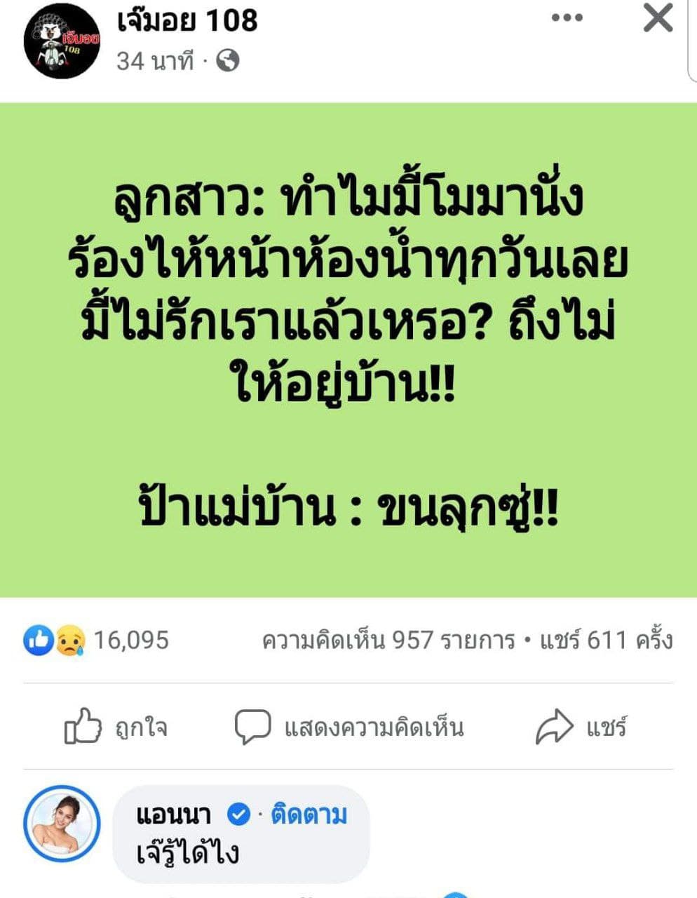 เล่นเอาโซเชียลขนลุกไปตาม ๆ กัน ที่ล่าสุด (4 มีนาคม 2565) เพจดัง เจ๊มอย 108 ได้ออกมาโพสต์ข้อความที่เกี่ยวกับ แตงโม นิดา นักแสดงสาวที่เพิ่งเสียชีวิตไปว่า แม่บ้านของแตงโมได้เปิดเผยว่า น้องอีสเตอร์ ลูกสาวของ กระติก ซึ่งเป็นลูกบุญธรรมของแตงโมได้มาบอกว่าเห็น มี้โม นั่งร้องไห้หน้าห้องน้ำทุกวัน