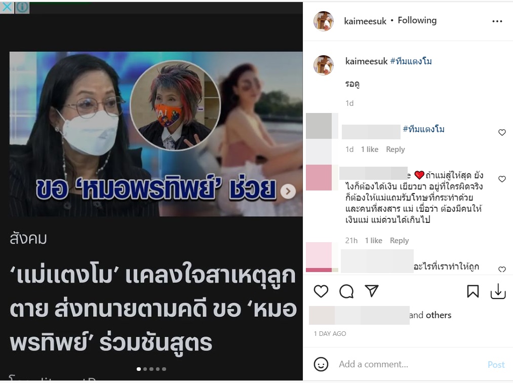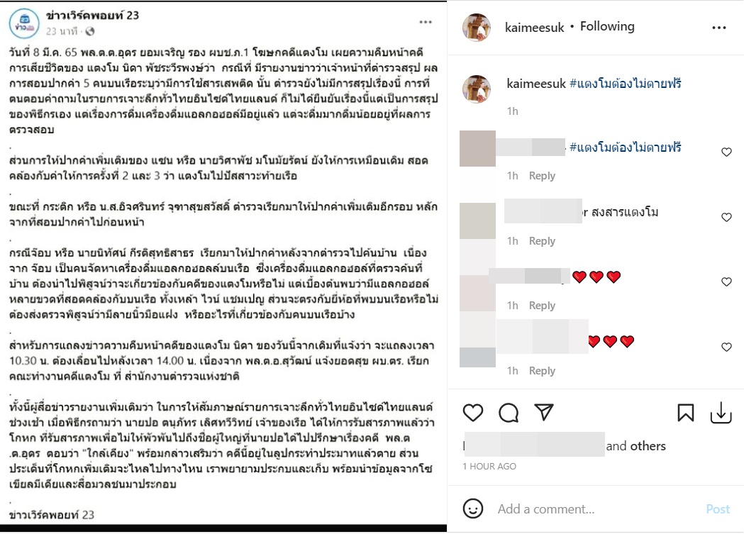 เป็นอีกหนึ่งคนดัง ที่คอยติดตามอัปเดตความคืบหน้าข่าวการเสียชีวิตของ แตงโม นิดา อย่างใจจดใจจ่อ สำหรับ ไก่ มีสุข อดีตผู้ประกาศข่าวและพิธีกรชื่อดัง ที่ออกมาโพสต์ข่าวคราวเกี่ยวกับเรื่องนี้จากสำนักข่าวและเพจต่าง ๆ ลง IG อย่างต่อเนื่อง รวมถึงรายงานการแถลงเรื่องคดีของตำรวจด้วย