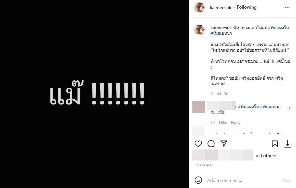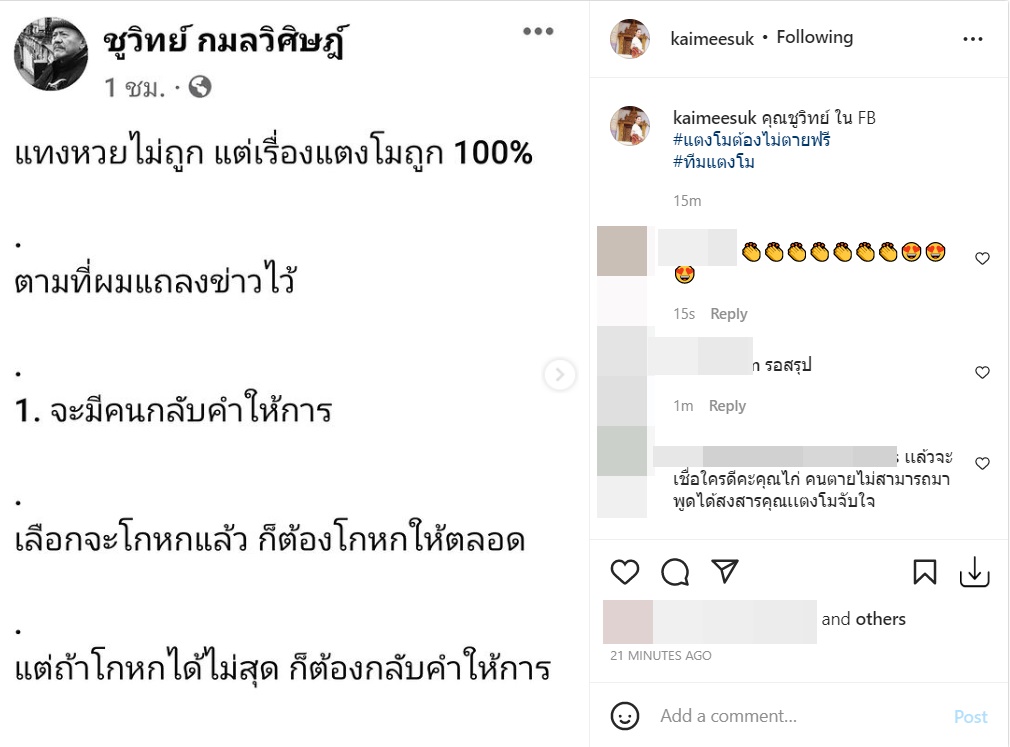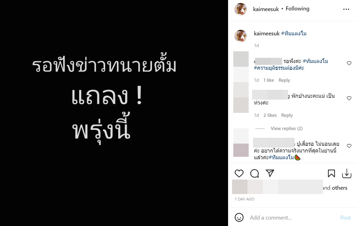นอกจากนี้ ไก่ มีสุข ยังได้ลงแคปชั่นว่า "บางทีเหยี่ยวข่าว ตามแหล่งต่าง ๆ ของพี่ก็ไม่มีไรจะรายงานละ" ซึ่งก็มีคนเข้ามากดไลก์โพสต์นี้กันเพียบ