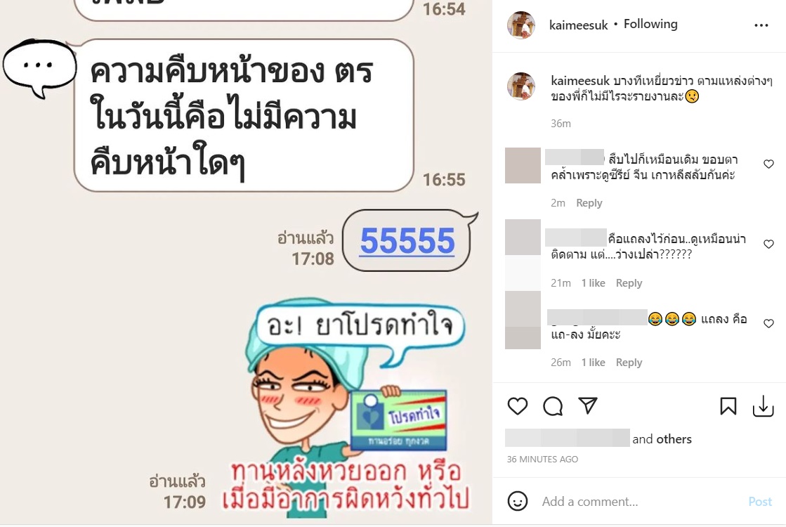 กระทั่งล่าสุด (8 มีนาคม 2565) ไก่ มีสุข ได้ออกมาเผยภาพแชตไลน์ที่คุยกับแหล่งข่าวรายหนึ่ง บอกกับเธอว่า "ความคืบหน้าของ ตร. ในวันนี้ คือไม่มีความคืบหน้าใด ๆ" ทำเอาเจ้าตัวถึงกับต้องส่งสติ๊กเกอร์มอบ "ยาโปรดทำใจ" ที่ใช้ทานหลังหวยออก หรือเมื่อมีอาการผิดหวังทั่วไป ให้กับอีกฝ่ายเลยทีเดียว