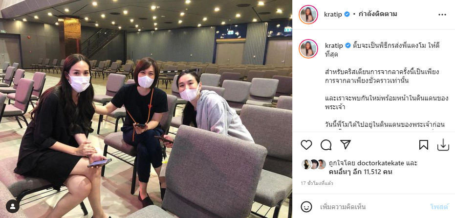 วันนี้พี่โมได้ไปอยู่ในดินแดนของพระเจ้าก่อนหน้าติ๊บแล้ว ขอให้ความรักของพระเจ้าที่สะท้อนผ่านพี่โม เป็นที่หนุนจิตชูใจของพวกเราทุกคนค่ะ ขอพระเจ้าอวยพรทุกคนค่ะ"