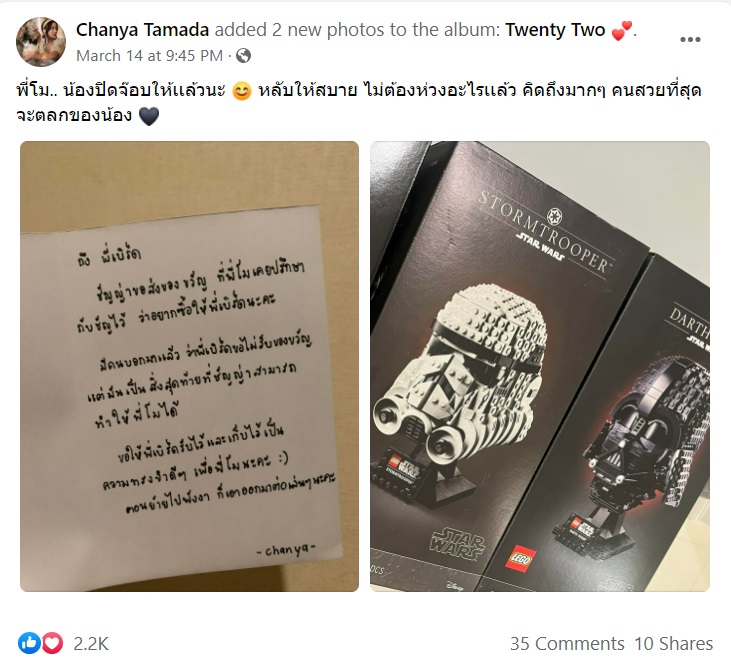 ทั้งนี้ ชัญญ่า ได้สานต่อความตั้งใจของแตงโมด้วยการซื้อโมเดล Star Wars เป็นของขวัญให้คุณเบิร์ดแล้ว พร้อมเขียนข้อความถึงแตงโมว่า "พี่โม.. น้องปิดจ๊อบให้เเล้วนะ หลับให้สบาย ไม่ต้องห่วงอะไรเเล้ว คิดถึงมาก ๆ คนสวยที่สุดจะตลกของน้อง"