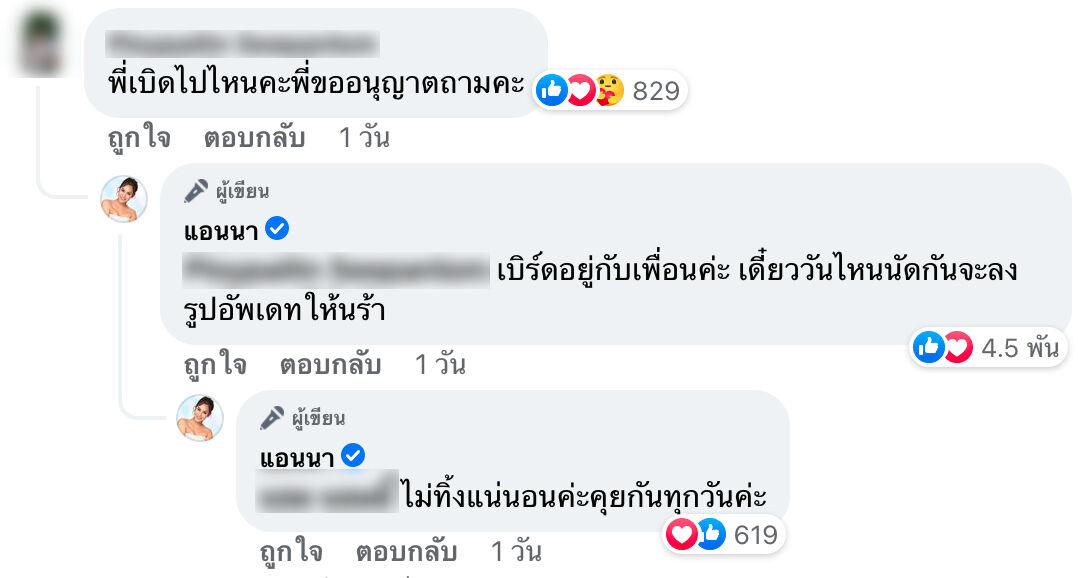 ด้านแอนนาก็ได้เข้าไปคอมเมนต์ตอบกลับ เบิร์ดอยู่กับเพื่อนค่ะ เดี๋ยววันไหนนัดกันจะลงรูปอัปเดตให้น้า" และยืนยันด้วยว่าจะไม่ทิ้งคนรักของเพื่อนแน่นอน "ไม่ทิ้งแน่นอนค่ะ คุยกันทุกวันค่ะ"