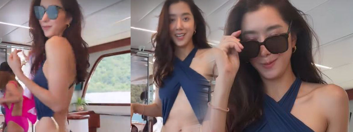 และไฮไลต์เด็ดอยู่ที่ชุดว่ายน้ำสบาย ๆ ของสาวไอซ์ ที่เจ้าตัวบอกว่าชุดวันพีซสีชมพูที่ถืออยู่ในมือใส่ไม่สบาย ก็เลยเปลี่ยนเป็นชุดสีน้ำเงินที่มีการแหวกช่วงเอว เว้าสูงช่วงต้นขาโชว์บั้นท้ายเนียนเด้ง แถมยังหมุนตัวโชว์ 1 กรุบ ลุคนี้ชนะเลิศไปเลยจ้า