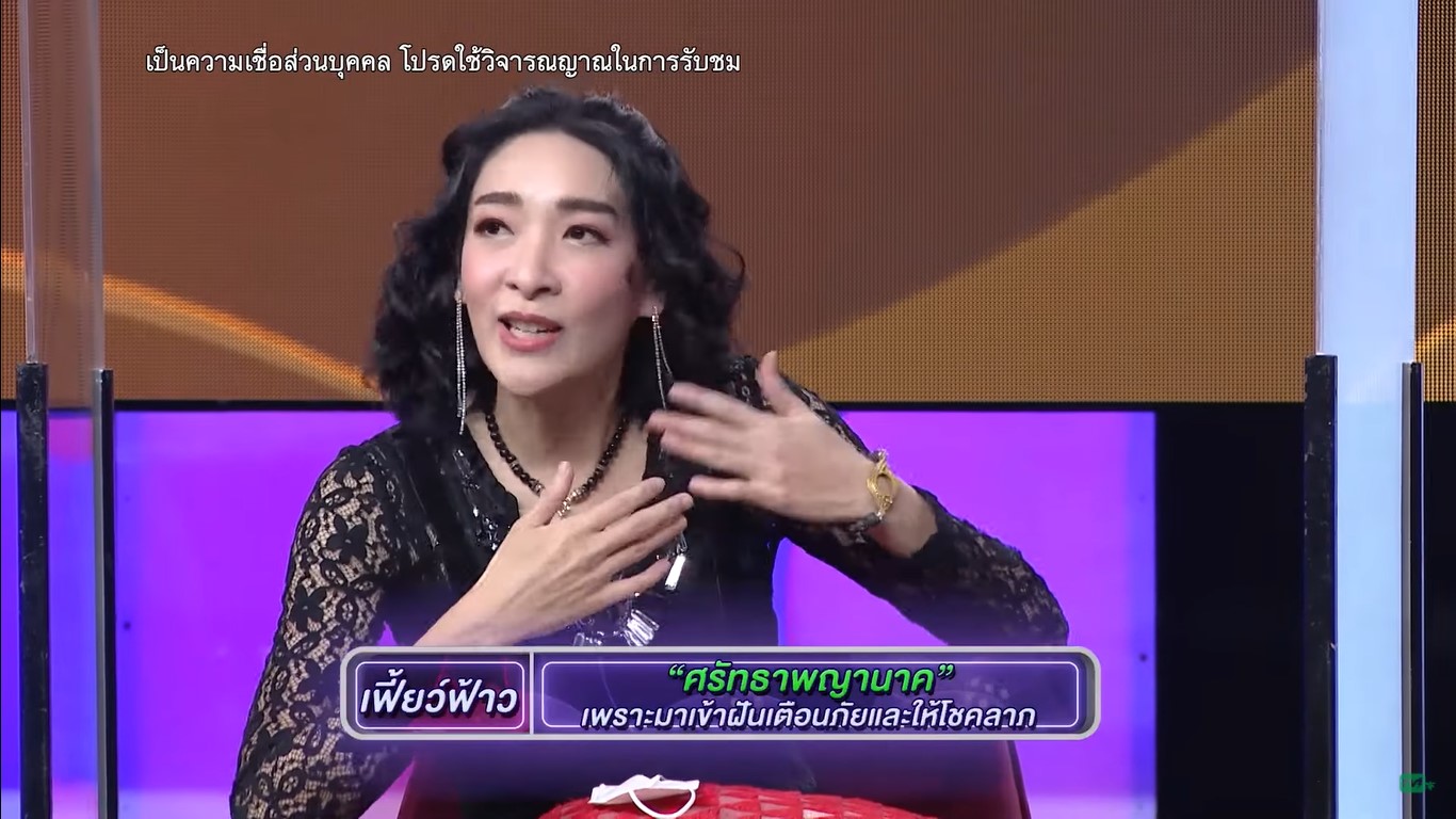 เมื่อผู้ร่วมรายการถามว่าท่านมาเตือนยังไง เธอก็เล่าต่อว่า “สมมติจะมีคนมาหักหลัง ท่านจะบอกเป็นคนนั้นเลยค่ะ แต่หนูเป็นมนุษย์อะเนาะ ก็ต้องน้อมรับเพราะมันคือชะตากรรมของหนู ในฝันเนี่ยจะบอกเป็นเรื่องราว แต่หนูอะชอบตีเป็นตัวเลข (หัวเราะ)”