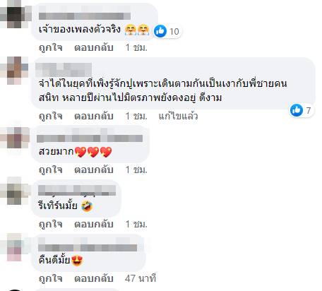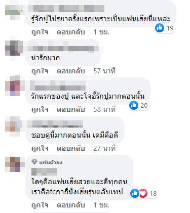 ด้านคอมเมนต์อื่น ๆ ที่ได้เห็นภาพนี้ต่างก็ชื่นชม มองว่าแม้เวลาผ่านไปนานแค่ไหน แม้จะเลิกรากันไป แต่ความเป็นเพื่อนนั้นสวยงามเสมอ บางคนก็เชียร์ มองว่าทั้งปู และโจอี้ บอย ก็โสด การกลับมาเจอกันในช่วงเวลานี้อาจจะมีความสัมพันธ์ดี ๆ เกิดขึ้นก็เป็นได้