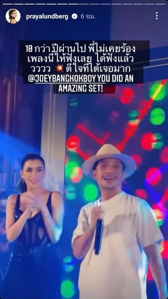 ด้านสาวปู ก็ได้โพสต์คลิปลงในอินสตาแกรมสตอรี่ เป็นภาพช่วงเวลาที่อยู่บนเวทีพร้อมระบุข้อความว่า "10 กว่าปีผ่านไป พี่ไม่เคยร้องเพลงนี้ให้ฟังเลย ได้ฟังแล้ววววว ดีใจที่ได้เจอมาก @joeybangkokboy You did an amazing set !"