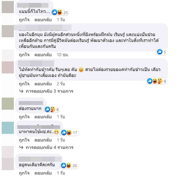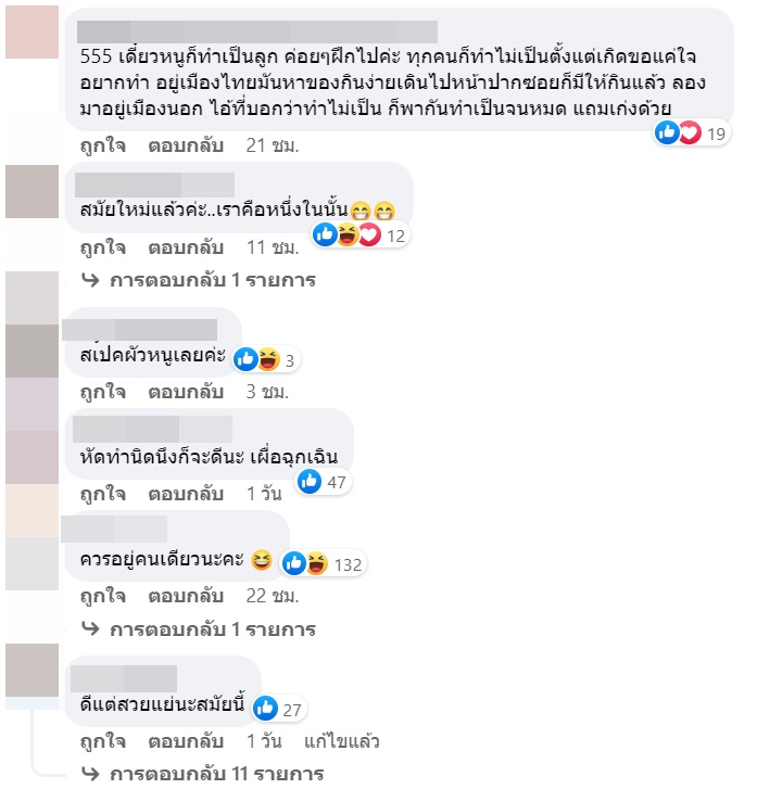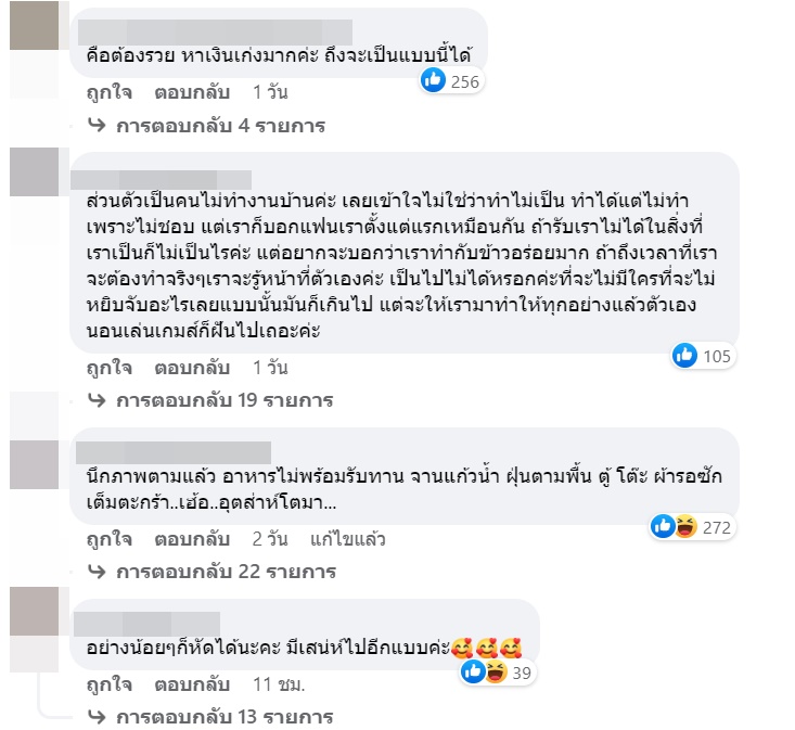 ทั้งนี้ได้มีคนคอมเมนต์วิพากษ์วิจารณ์ถึงเรื่องดังกล่าวกันมากมาย ทั้งคนที่มองว่าต่อให้สวยแต่ขนาดนี้ก็ไม่ไหว ควรหัดทำบ้าง ไม่อย่างนั้นก็ควรอยู่คนเดียว บ้างก็รับได้ ผู้ชายพร้อมเป็นฝ่ายทำให้ แต่อีกส่วนก็มองว่านี่คือสมัยใหม่แล้ว คนที่เป็นแบบนี้ก็มี เรื่องแบบนี้แล้วแต่สไตล์ แล้วแต่คนชอบ