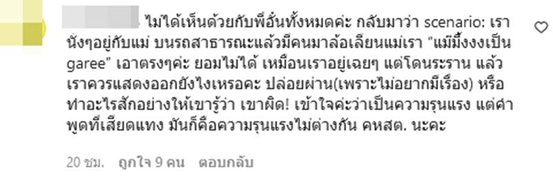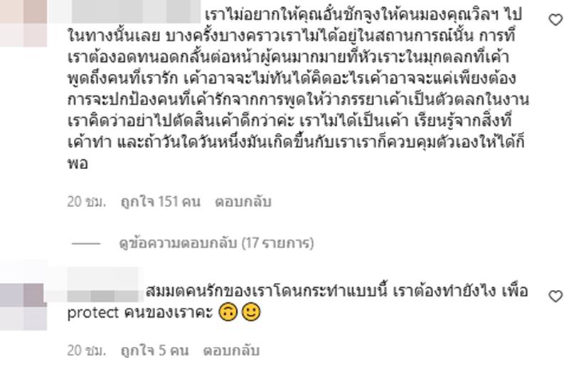 นอกจากนี้ ยังตั้งคำถามไปที่อั๋นอีกว่า สมมติถ้าคนรักของเราโดนกระทำแบบนี้ เราต้องทำยังไง เพื่อปกป้องคนของเรา