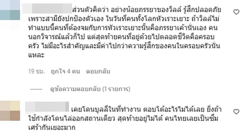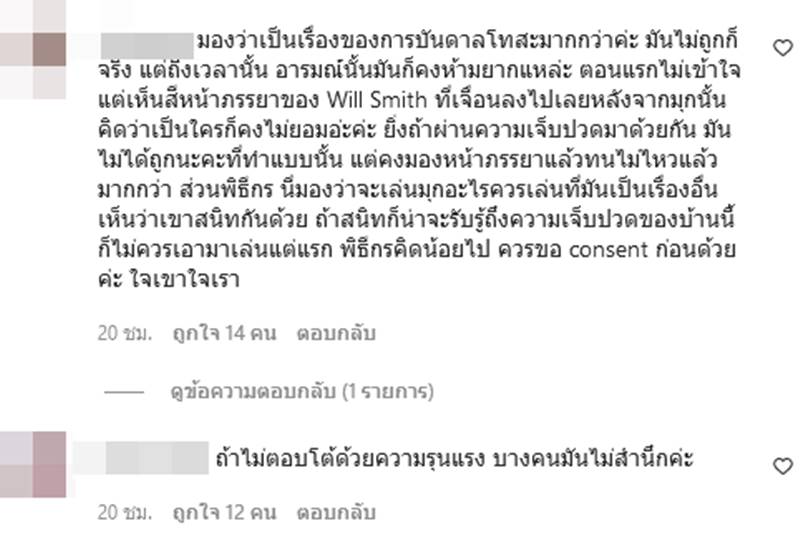 แต่ก็มีอีกด้านที่เห็นต่างว่า ถ้าไม่ตอบโต้ด้วยความรุนแรง บางคนมันไม่สำนึก และยังมีคนมองว่าอย่างน้อยภรรยาของวิลล์ รู้สึกปลอดภัยเพราะสามียังปกป้องตัวเอง ในวันที่คนทั้งโลกหัวเราะเยาะ ถ้าวิลล์ไม่ทำแบบนี้คนที่ต้องจมกับการหัวเราะเยาะนั้นคือภรรยาเขานั่นเอง และมองว่าเป็นเรื่องของการบันดาลโทสะมากกว่า มันไม่ถูกก็จริง แต่ถึงเวลานั้น อารมณ์นั้นมันก็คงห้ามยาก ตอนแรกไม่เข้าใจ แต่เห็นสีหน้าภรรยาของวิลล์ ที่เจื่อนลงไปเลยหลังจากมุกนั้น คิดว่าเป็นใครก็คงไม่ยอม
