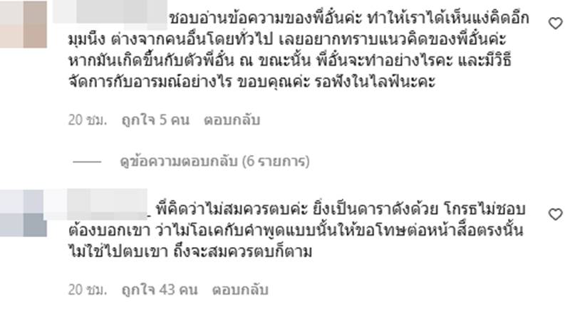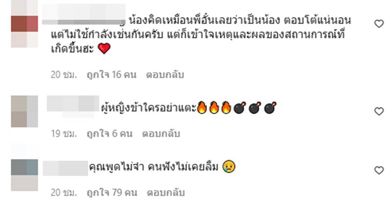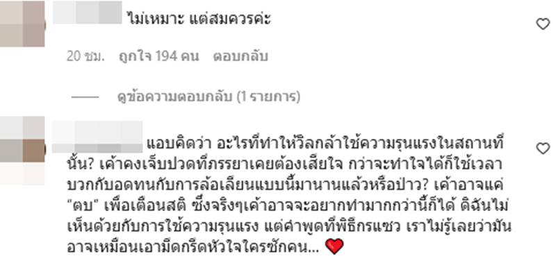 โดยหลายหลังจากอั๋นออกมาโพสต์เรื่องดังกล่าวก็มีชาวเน็ตเข้ามาคอมเมนต์แสดงความคิดเห็นกันเป็นจำนวนมาก ซึ่งก็มีทั้งคนที่เห็นด้วยกับอั๋นว่าไม่ควรใช้ความรุนแรงจบปัญหานี้ ยิ่งเป็นดาราดังด้วย โกรธ ไม่ชอบต้องบอกเขาว่าไม่โอเคกับคำพูดแบบนั้น ให้ขอโทษต่อหน้าสื่อตรงนั้นไม่ใช่ไปตบเขา ถึงจะสมควรตบก็ตาม