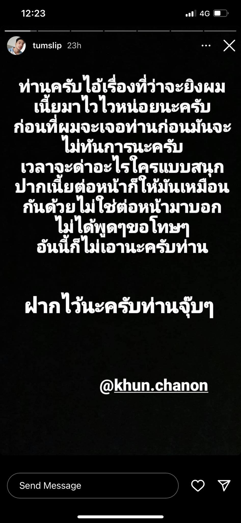 "ท่านครับ ไอ้เรื่องที่ว่าจะยิงผมเนี่ย มาไว ๆ หน่อยนะครับ ก่อนที่ผมจะเจอท่าน ก่อนที่มันจะไม่ทันกาล เวลาจะด่าอะไรใครแบบสนุกปากเนี่ย ต่อหน้าก็ให้มันเหมือนกันด้วย ไม่ใช่ต่อหน้ามาบอกไม่พูด ๆ ขอโทษ ๆ อันนี้ก็ไม่เอานะครับท่าน ฝากไว้นะครับท่าน จุ๊บ ๆ @khun.chanon"