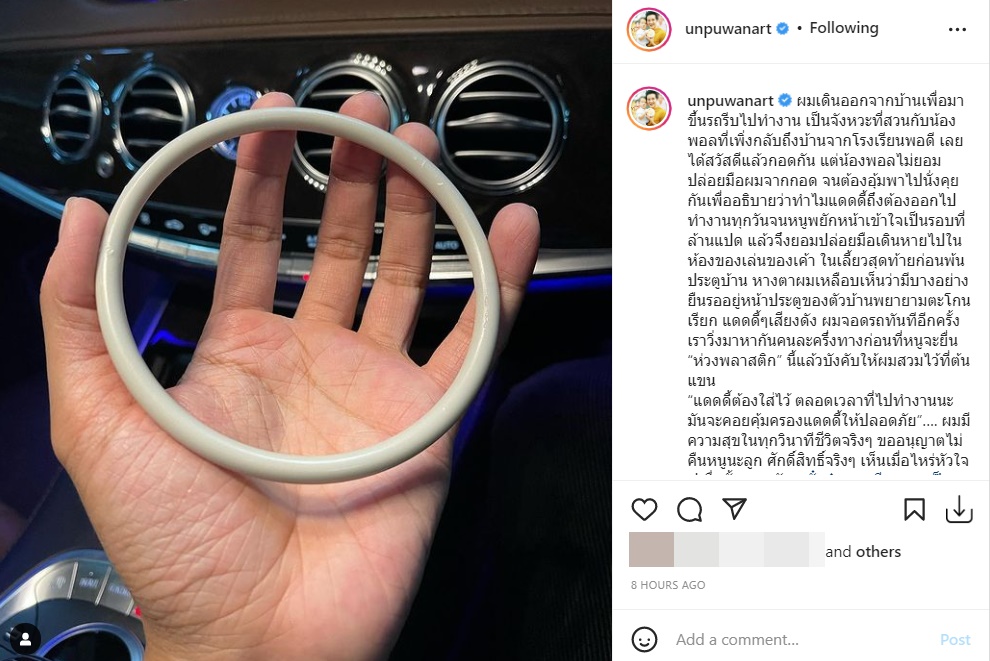 "ผมเดินออกจากบ้านเพื่อมาขึ้นรถรีบไปทำงาน เป็นจังหวะที่สวนกับน้องพอลที่เพิ่งกลับถึงบ้านจากโรงเรียนพอดี เลยได้สวัสดีแล้วกอดกัน แต่น้องพอลไม่ยอมปล่อยมือผมจากกอด จนต้องอุ้มพาไปนั่งคุยกันเพื่ออธิบายว่าทำไมแดดดี้ถึงต้องออกไปทำงานทุกวันจนหนูพยักหน้าเข้าใจเป็นรอบที่ล้านแปด แล้วจึงยอมปล่อยมือเดินหายไปในห้องของเล่นของเค้า ในเลี้ยวสุดท้ายก่อนพ้นประตูบ้าน หางตาผมเหลือบเห็นว่ามีบางอย่างยืนรออยู่หน้าประตูของตัวบ้านพยายามตะโกนเรียก แดดดี้ ๆ เสียงดัง ผมจอดรถทันทีอีกครั้ง เราวิ่งมาหากันคนละครึ่งทางก่อนที่หนูจะยื่น "ห่วงพลาสติก" นี้แล้วบังคับให้ผมสวมไว้ที่ต้นแขน