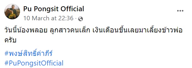 และเมื่อย้อนไปวันที่ 10 มีนาคม ที่ผ่านมา พลอย ลูกสาวคนเล็กของปู พงษ์สิทธิ์ มีการนัดเลี้ยงข้าวคุณพ่อ ฉลองเงินเดือนขึ้น แม้จะไม่มากไม่มาย แต่สำหรับคนเป็นพ่อถือว่ายิ่งใหญ่และมีความสุขที่สุด ถึงกับลงรูปกอดรัดฟัดเหวี่ยงลูกสาว ที่เลี้ยงดูจนเติบใหญ่มาเป็นคนดี และวันนี้ก็ได้เดินตามเส้นทางความฝันของตัวเองได้แล้ว