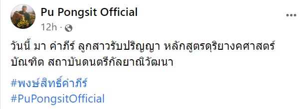 วันที่ 1 เมษายน 2565 นับเป็นข่าวที่น่ายินดีเรื่องหนึ่งสำหรับปู พงษ์สิทธิ์ คำภีร์ ศิลปินเพื่อชีวิตชื่อดัง ที่นอกเหนือจากเป็นศิลปินแล้ว อีกด้านปูก็ยังทำหน้าที่คุณพ่อได้อย่างครบถ้วนสมบูรณ์แบบ จนกระทั่งถึงวันนี้ ที่ลูกสาวปูเดินมาถึงฝั่งฝัน รับปริญญาด้านดนตรี เดินตามรอยเท้าคุณพ่อ