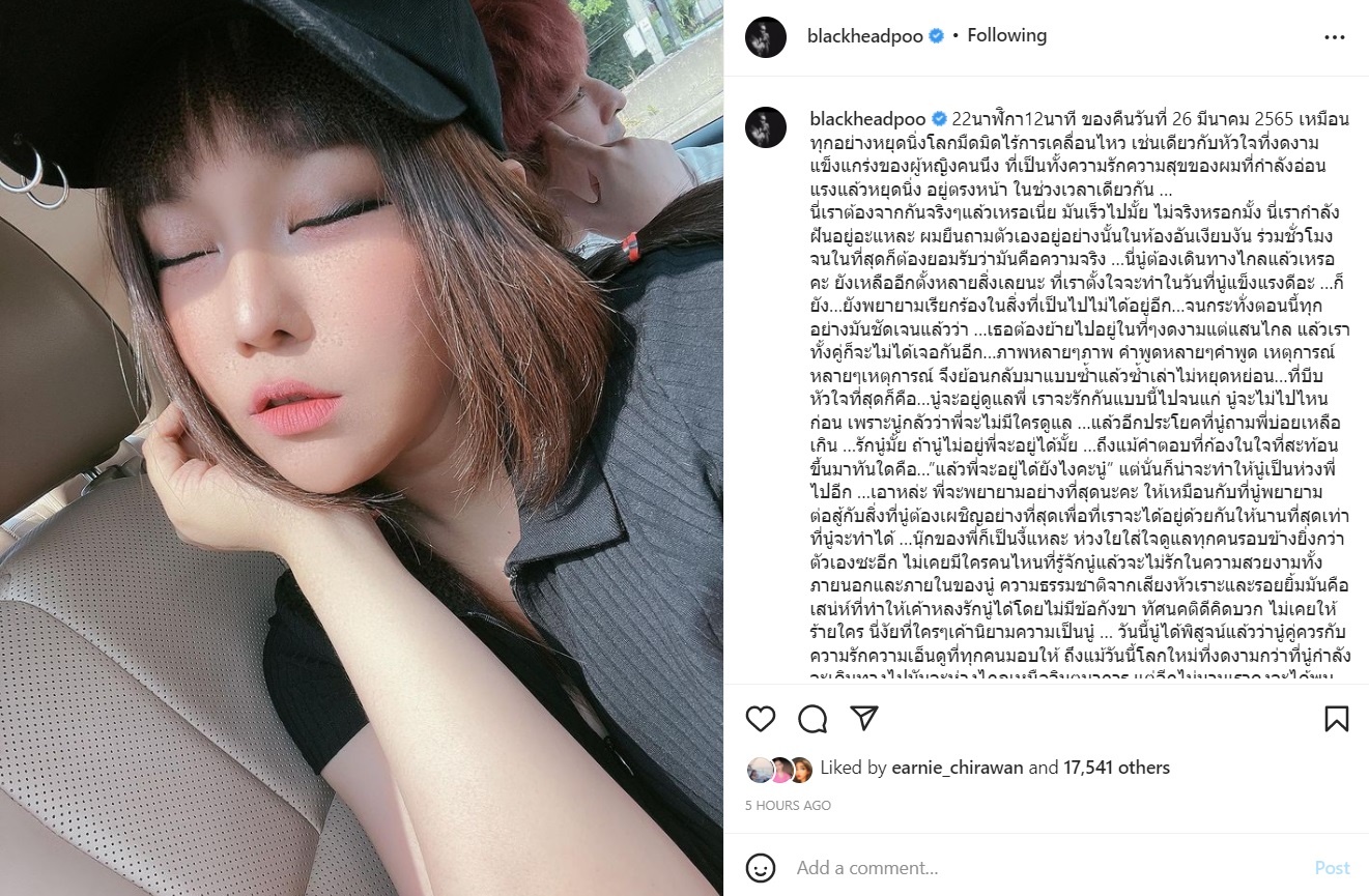 ล่าสุด (2 เมษายน 2565) ปู แบล็คเฮด มีการโพสต์ภาพของนุ๊กซี่ พร้อมเขียนข้อความอาลัยรัก ระบุว่า "22 นาฬิกา 12 นาที ของคืนวันที่ 26 มีนาคม 2565 เหมือนทุกอย่างหยุดนิ่ง โลกมืดมิดไร้การเคลื่อนไหว เช่นเดียวกับหัวใจที่งดงามแข็งแกร่งของผู้หญิงคนหนึ่ง ที่เป็นทั้งความรักความสุขของผมที่กำลังอ่อนแรงแล้วหยุดนิ่งอยู่ตรงหน้าในช่วงเวลาเดียวกัน...