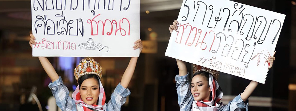 แต่ที่ฮือฮาสุด ๆ คงเป็นสาวงามจากภาคอีสานอย่าง จิม จารุวรรณ ม่อนพะเนาว์ มิสแกรนด์ร้อยเอ็ด ที่มาในลุคสาวชาวนา โดยเธอใส่เสื้อผ้าที่ใช้ในการทำนากับครอบครัวจริง ๆ พร้อมทั้งถือป้าย "รักษาสัญญาชาวนารออยู่ #ม็อบชาวนา" และป้าย "เงียบกว่าทุกข่าวคือเสียงชาวนา" เพื่อเป็นปากเสียงให้ชาวนาในการเรียกร้องราคาข้าวตกต่ำ