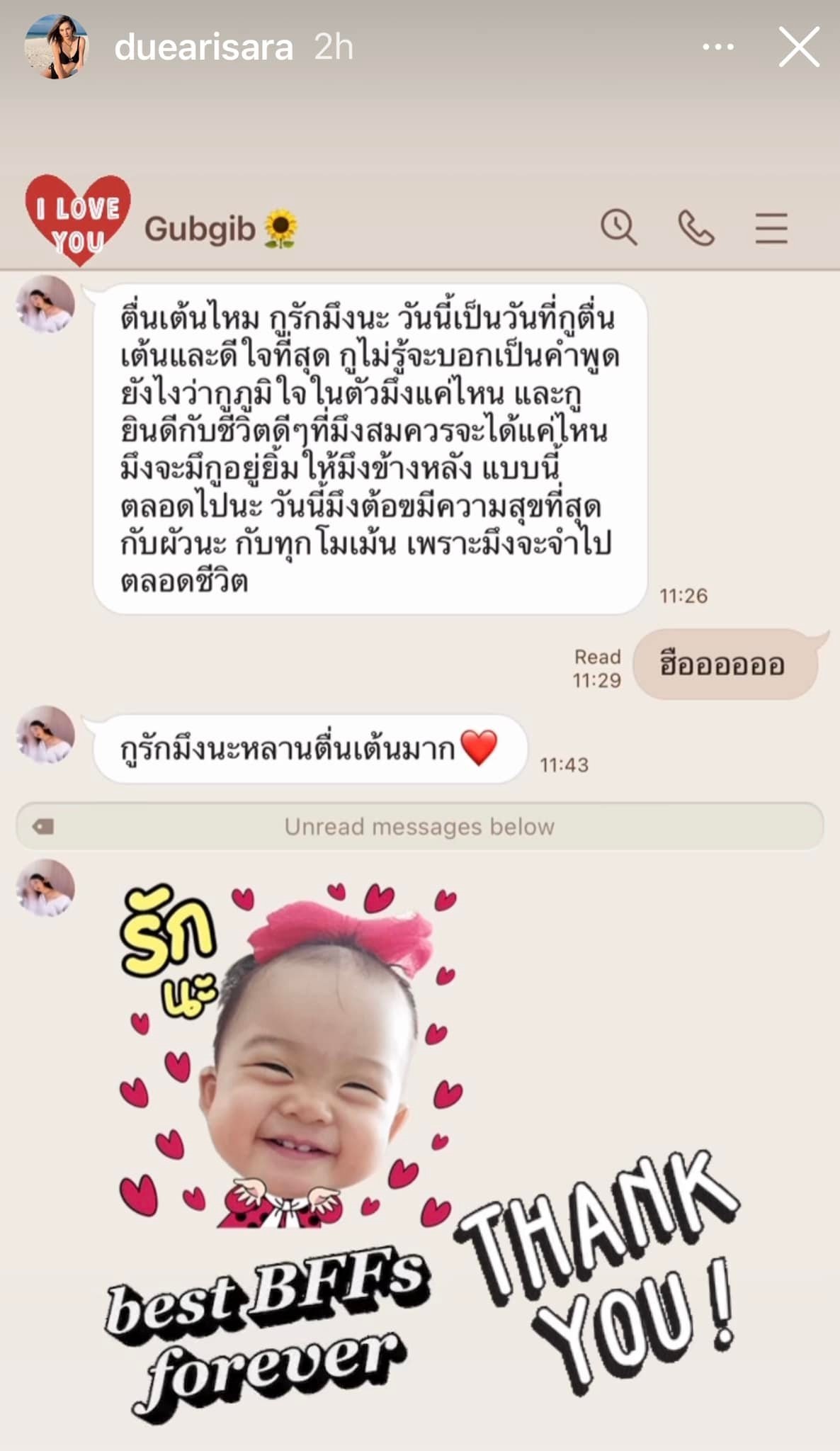 ขณะที่ สาวดิว ก็ตอบกลับไปว่า "ฮืออออออออออออ" ด้านกุ๊บกิ๊บก็ส่งกลับมาว่า "กูรักมึงนะ หลานตื่นเต้นมาก" และอีโมจิรูปหัวใจ