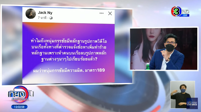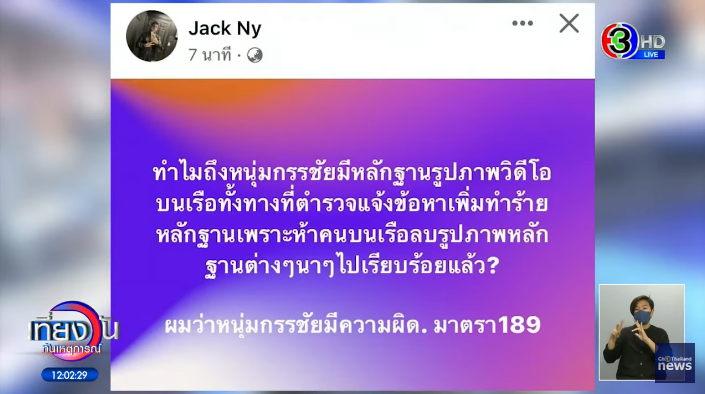 จากนั้น บังแจ็ค ก็ออกมาโพสต์ถึง หนุ่ม กรรชัยว่า "ทำไมถึงหนุ่ม กรรชัย มีหลักฐานรูปภาพวิดีโอบนเรือ ทั้งทางที่ตำรวจแจ้งข้อหาเพิ่มทำลายหลักฐานเพราะห้าคนบนเรือลบรูปภาพหลักฐานต่าง ๆ นานาไปเรียบร้อยแล้ว ? ผมว่าหนุ่ม กรรชัย มีความผิด มาตรา 189"