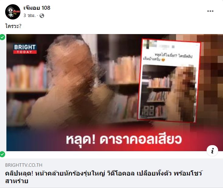 งานนี้ทำเอาหลายคนสงสัย ว่าคลิปหลุดดังกล่าวเป็นของ "นักร้องรุ่นใหญ่" รายนี้จริง หรือแค่คนหน้าคล้าย ขณะที่เพจ เจ๊มอย 108 ก็แชร์ข่าวนี้ พร้อมข้อความว่า "ใครวะ ?"