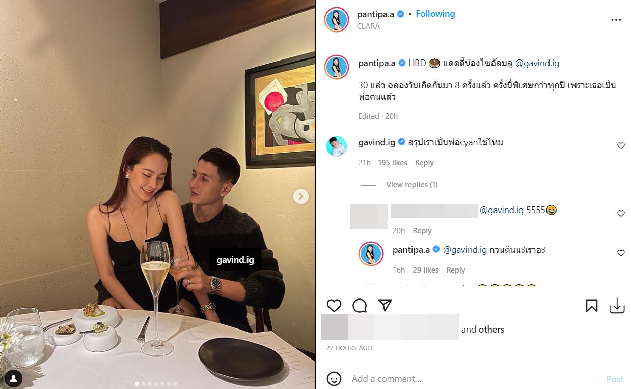 แต่งานนี้ก็ยังไม่วายมีโมเมนต์พีค ๆ เมื่อหนุ่มกวินท์ เข้ามาคอมเมนต์สุดปั่นว่า "สรุปเราเป็นพ่อ cyan ใช่ไหม" ก่อนที่สาวปุ้มปุ้ย จะตอบกลับว่า "กวนตีนนะเราอะ" ทำแฟน ๆ ลั่นไปตาม ๆ กัน