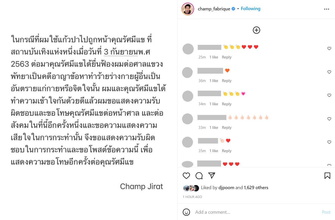 ผมขอแสดงความรับผิดชอบและขอโทษคุณรัศมีแขต่อหน้าศาล และต่อสังคมในที่นี้อีกครั้งหนึ่ง และขอแสดงความเสียใจในการกระทำนั้น จึงขอแสดงความรับผิดชอบในการกระทำ และขอโพสต์ข้อความนี้ เพื่อแสดงความขอโทษอีกครั้งต่อคุณรัศมีแข"