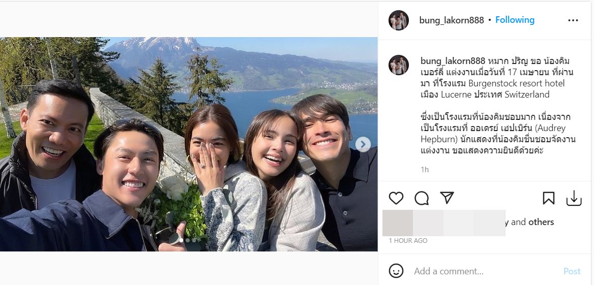 "หมาก ปริญ ขอ น้องคิมเบอร์ลี่ แต่งงานเมื่อวันที่ 17 เมษายน ที่ผ่านมา ที่โรงแรม Burgenstock resort hotel เมือง Lucerne ประเทศ Switzerland ซึ่งเป็นโรงแรมที่น้องคิมชอบมาก เนื่องจากเป็นโรงแรมที่ ออเดรย์ เฮปเบิร์น (Audrey Hepburn) นักแสดงที่น้องคิมชื่นชอบจัดงานแต่งงาน ขอแสดงความยินดีด้วยค่ะ"