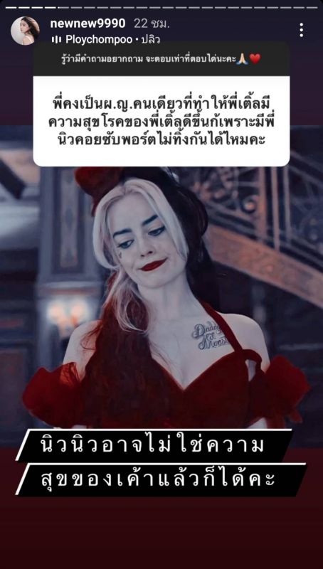 แฟนคลับ : พี่คงเป็นผู้หญิงคนเดียวที่ทำให้พี่เติ้ลมีความสุข โรคของพี่เติ้ลดีขึ้นก็เพราะมีพี่นิว คอยซัพพอร์ตไม่ทิ้งกันได้ไหมคะ