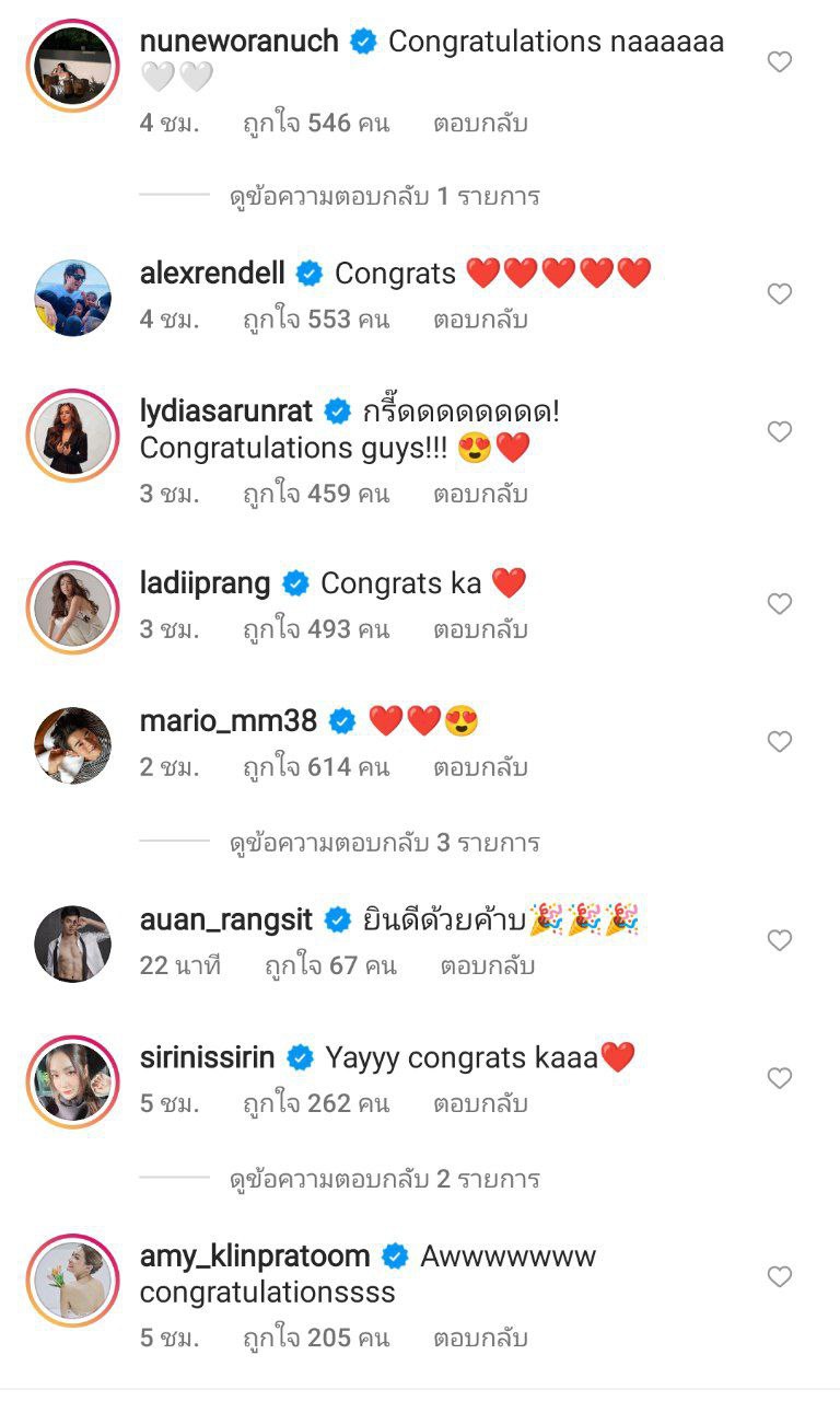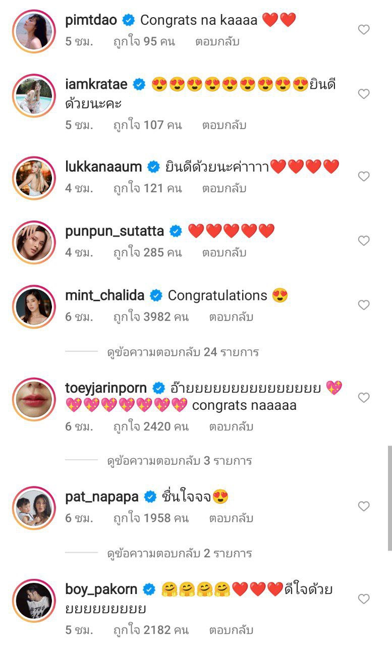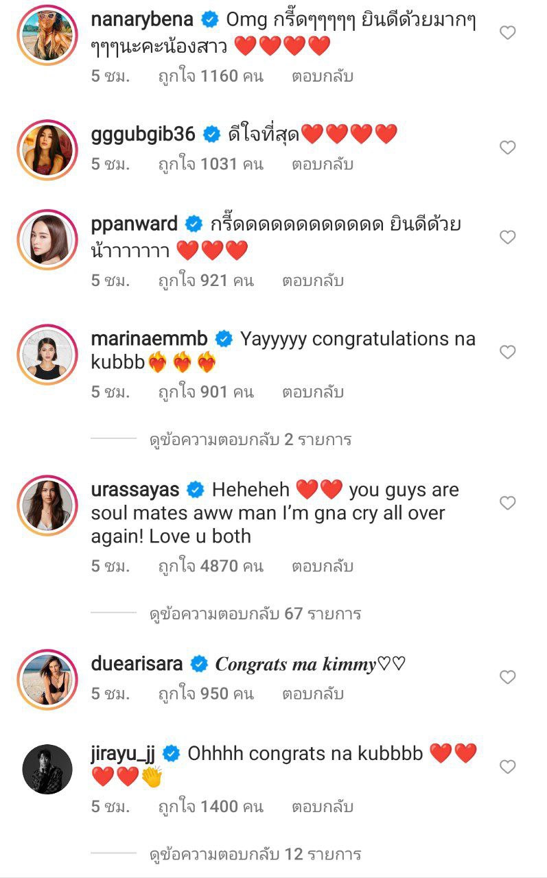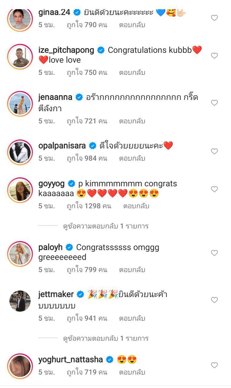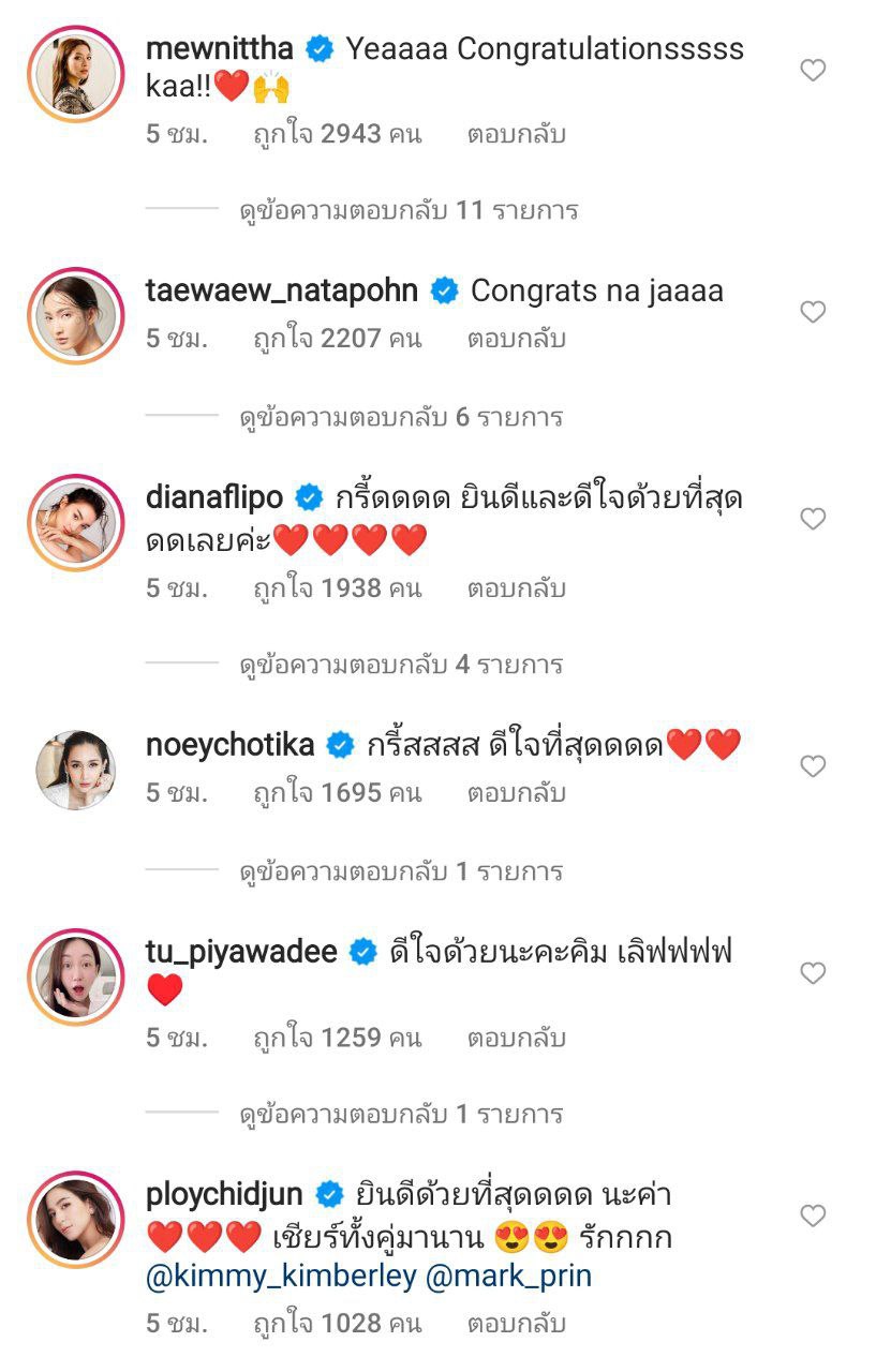 นอกจากนี้ยังมีดารา ผู้จัด คนดังในวงการบันเทิงไทย เข้ามาคอมเมนต์ร่วมแสดงความยินดีกับ หมาก คิม กันอย่างคับคั่ง อาทิ เจ็ท ณัฐพงศ์, นุ่น วรนุช, ดิว อริสรา, เต้ย จรินทร์พร, มิว นิษฐา, แพท ณปภา, พีช พชร, มาริโอ้ เมาเร่อ, เจมส์ มาร์, คริส หอวัง, นาย ณภัทร, แต้ว ณฐพร, เจมส์ จิรายุ, เป้ย ปานวาด ฯลฯ