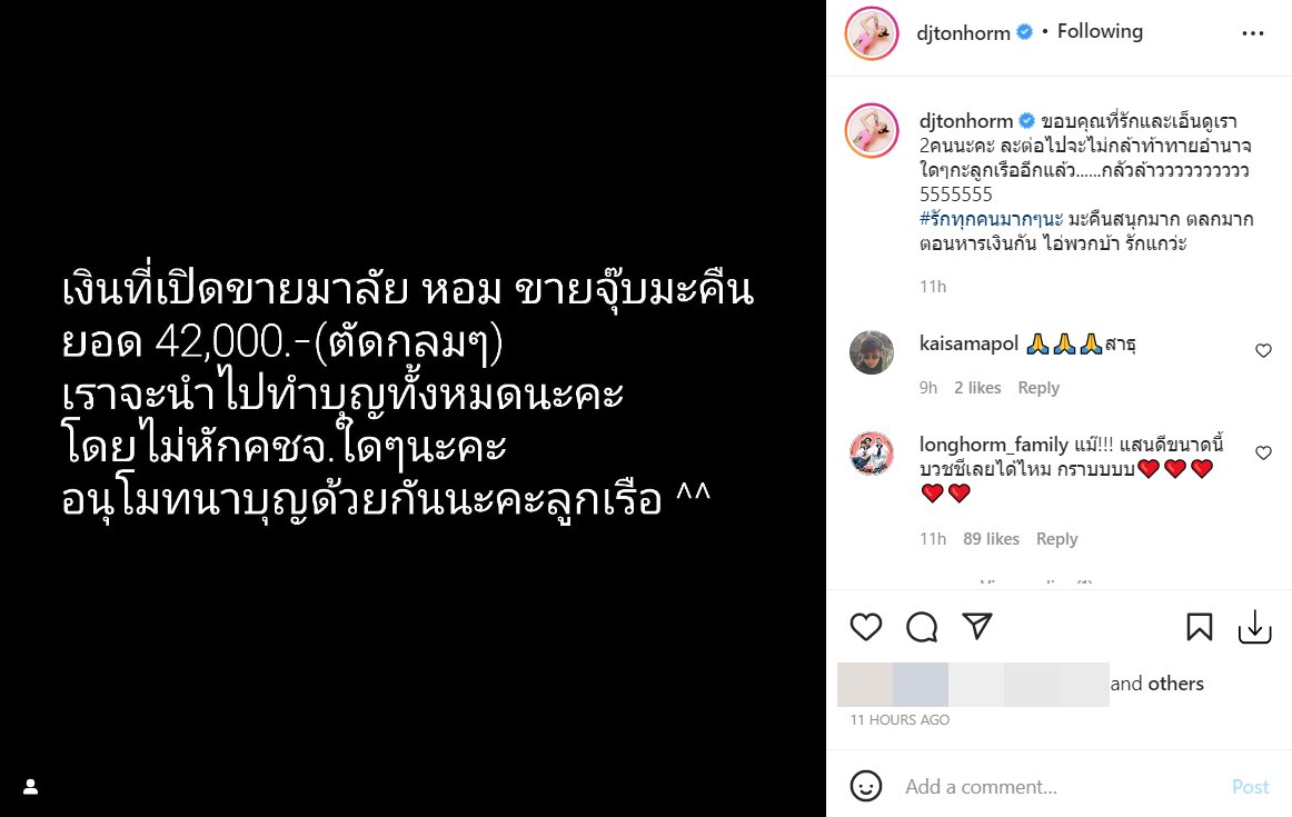 โดยหลังจากจบไลฟ์ดังกล่าว ล่าสุด (27 เมษายน 2565) ดีเจต้นหอม ก็ออกมาอัปเดตว่า เงินที่เปิดขายมาลัย หอม ขายจุ๊บเมื่อคืน ได้ยอดตัดกลม ๆ 42,000 บาท ซึ่งเราจะนำไปทำบุญทั้งหมดโดยไม่หักค่าใช้จ่ายใด ๆ ให้ลูกเรือร่วมอนุโมทนาบุญกัน พร้อมยังเปิดใจด้วยว่า "ขอบคุณที่รักและเอ็นดูเรา 2 คนนะคะ ละต่อไปจะไม่กล้าท้าทายอำนาจใด ๆ กะลูกเรืออีกแล้ว......กลัวล้าวววววววววว 5555555 #รักทุกคนมากๆนะ มะคืนสนุกมาก ตลกมากตอนหารเงินกัน ไอ่พวกบ้า รักแกว่ะ"