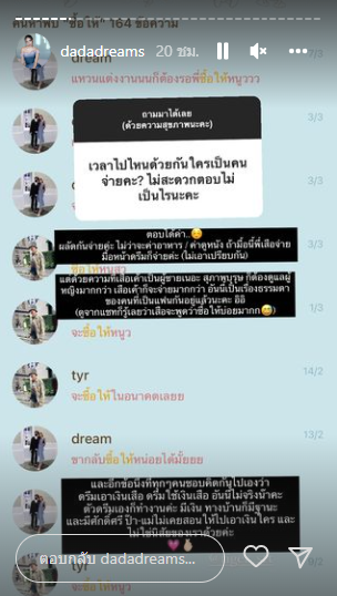 ดรีม : ตอบได้ค่า ผลัดกันจ่ายค่ะ ไม่ว่าจะค่าอาหาร ค่าดูหนัง ถ้ามื้อนี้พี่เสือจ่าย มื้อหน้าดรีมก็จ่ายค่ะ (ไม่เอาเปรียบกัน) แต่ด้วยความที่พี่เสือเขาเป็นผู้ชายเนอะ สุภาพบุรุษก็ต้องดูแลผู้หญิงมากกว่า อันนี้เป็นเรื่องธรรมดาของคนที่เป็นแฟนกันอยุ่แล้วนะคะ อิอิ (ดูจากแชตก็รู้เลยว่าเสือพูดว่าซื้อให้บ่อยมาก) และอีกข้อหนึ่งที่ทุกคนคิดไปกันเองว่า ดรีมเอาเงินเสือ ดรีมใช้เงินเสือ อันนี้ไม่จริงน้าคะ ตัวดรีมเองก็ทำงานค่ะ มีเงิน ทางบ้านก็มีฐานะและมีศักดิ์ศรี ป๊า-แม่ไม่เคยสอนให้ไปเองเงินใคร และไม่ใช่นิสัยของเราด้วยค่ะ
