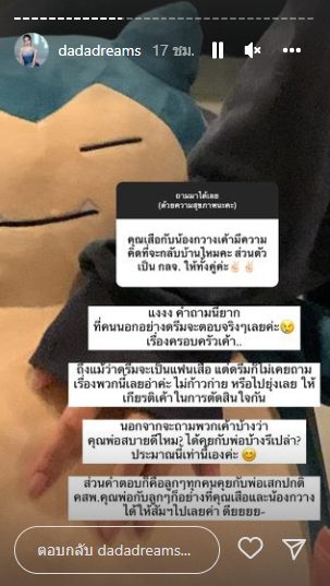 ดรีม : โอ้โห เรื่องนี้คนนอกอย่างน้องดรีมตอบยากเลยค่ะ ไม่อยากเข้าไปยุ่ง หรือก้าวก่ายปัญหาภายในครอบครัวของใครเลย เอาเป็นว่ารอพี่เสือทำ Q&A มาตอบเองดีกว่าค่า
