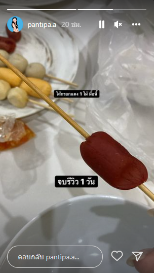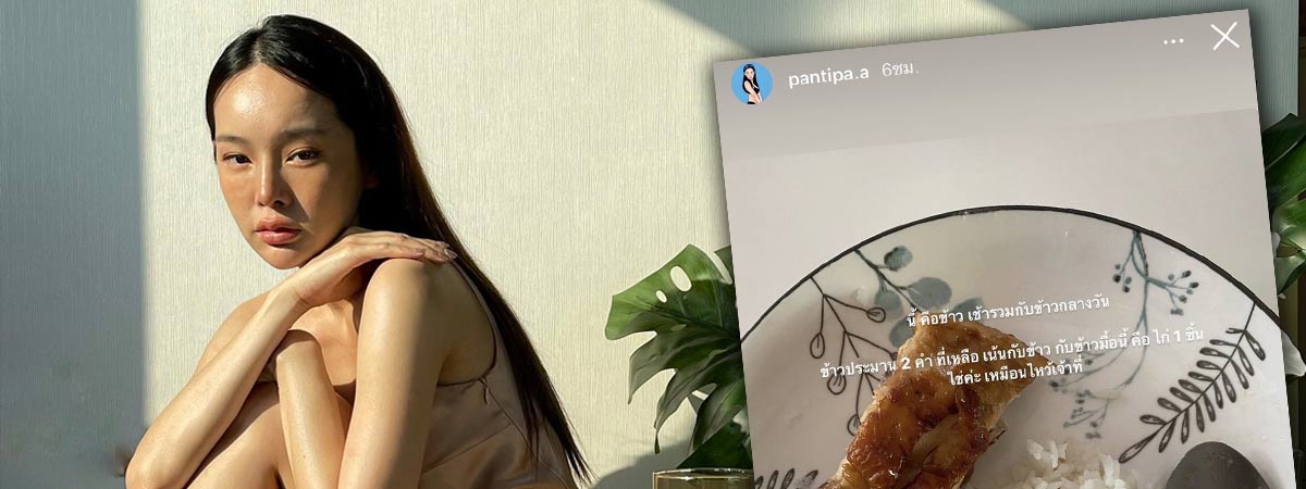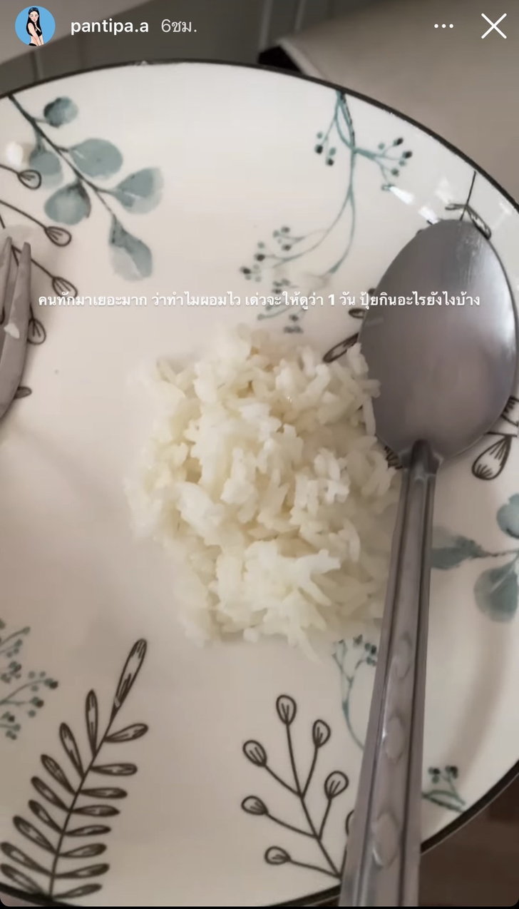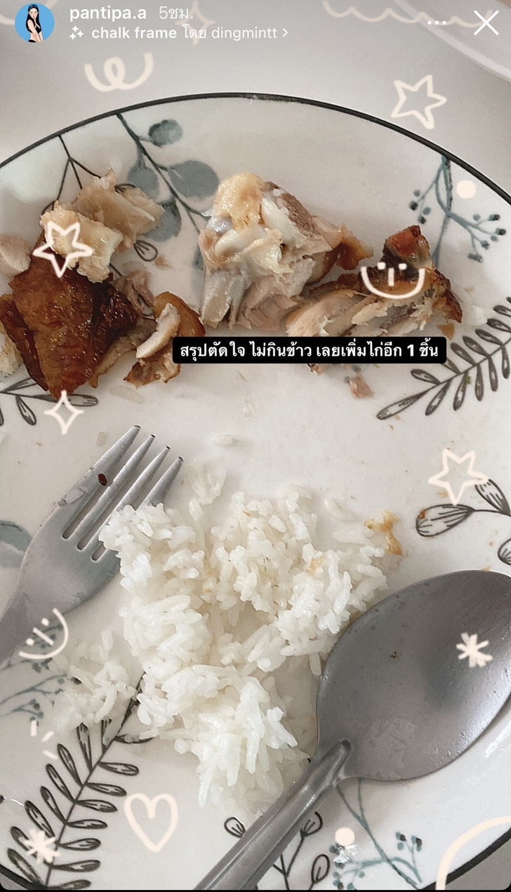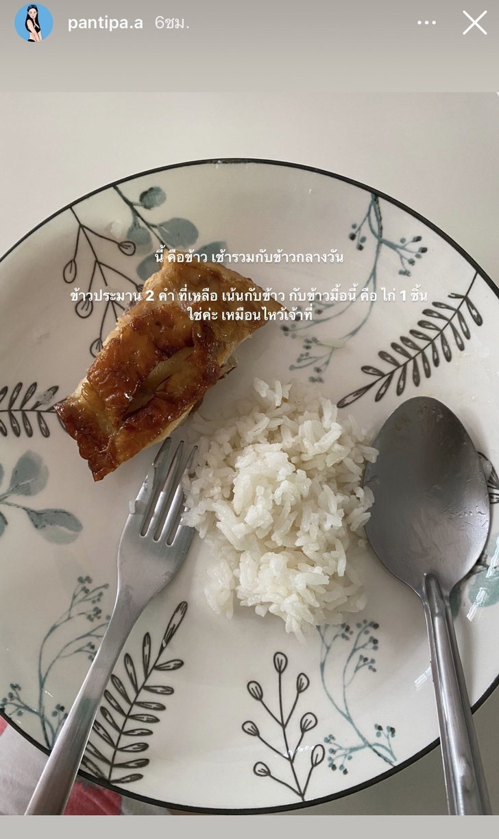 โดยโพสต์ต่อมาก็ได้โพสต์ภาพจานอาหาร ที่มีข้าวและไก่ 1 ชิ้น พร้อมระบุว่า "นี่คือข้าวเช้ารวมกับข้าวกลางวัน ข้าวประมาณ 2 คำ ที่เหลือเน้นกับข้าว กับข้าวมื้อนี้คือไก่ 1 ชิ้น ใช่ค่ะ เหมือนไหว้เจ้าที่" และอีกหนึ่งโพสต์ต่อมาว่า "สรุปตัดใจไม่กินข้าว เลยเพิ่มไก่อีก 1 ชิ้น"