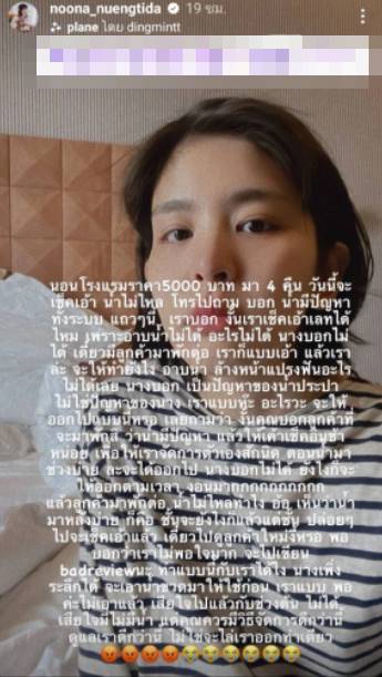 "นอนโรงแรม ราคา 5,000 บาท มา 4 คืน วันนี้ จะเช็คเอ้าท์ น้ำไม่ไหล โทรไปถาม บอก น้ำมีปัญหาทั้งระบบแถว ๆ นี้ เราบอก งั้นเราเช็กเอ้าท์เลตได้ไหม เพราะอาบน้ำไม่ได้ อะไรไม่ได้ นางบอกไม่ได้ เดี๋ยวมีลูกค้ามาพักต่อ เราก็แบบเอ้า แล้วเราล่ะ จะให้ทำยังไง อาบน้ำ ล้างหน้าแปรงฟันอะไร ไม่ได้เลย นางบอก เป็นปัญหาของน้ำประปา ไม่ใช่ปัญหาของนาง