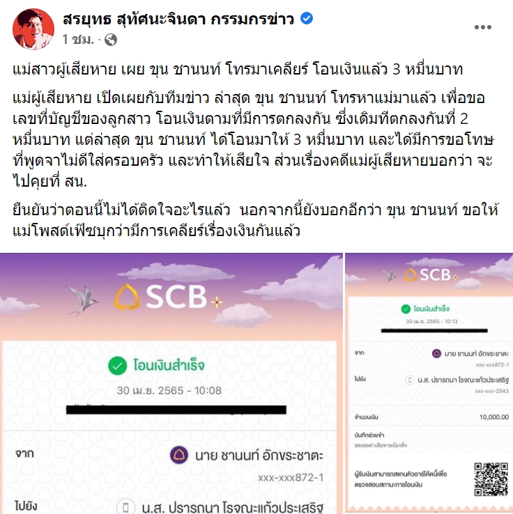 ขุนโทร. ขอโทษแม่ผู้เสียหาย ยอมโอนจ่ายเต็ม - ขอให้โพสต์บอกว่าโอนเงินให้แล้ว