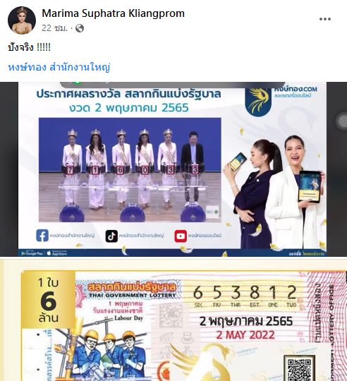 และความพีคขั้นสุดก็เกิดขึ้น เมื่อ มารีม่า สุภัทรา รองอันดับ 4 มิสแกรนด์ไทยแลนด์ 2022 เมื่อเจ้าตัวนั้นถูกรางวัลสลากกินแบ่งรัฐบาลที่เธอมีโอกาสหมุนวงล้อเองด้วย แถมยังเฮงหนักด้วยการถูกรางวัลที่ 4 ได้รับเงินรางวัล 40,000 บาทเลยทีเดียว และยังแว่วมาว่าลอตเตอรี่นี้เป็นรางวัลจากกองประกวดด้วย