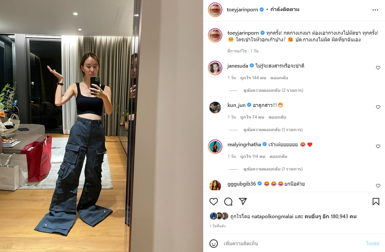 ขณะที่เพื่อนดาราและแฟนคลับต่างเข้ามาคอมเมนต์แซวกันยกใหญ่ว่า ไม่รู้จะขำหรือสงสารก่อนดี ส่วนสาว ๆ อีกหลายคนก็เข้าใจถึงปัญหานี้ดี เพราะเจอมากับตัวเหมือนกัน บ้างก็ปิ๊งไอเดียแบบเอาฮาว่า ไม่ต้องตัดขาหรอก ใส่ทั้งแบบนี้นำเทรนด์ใหม่ไปเลย อิอิ