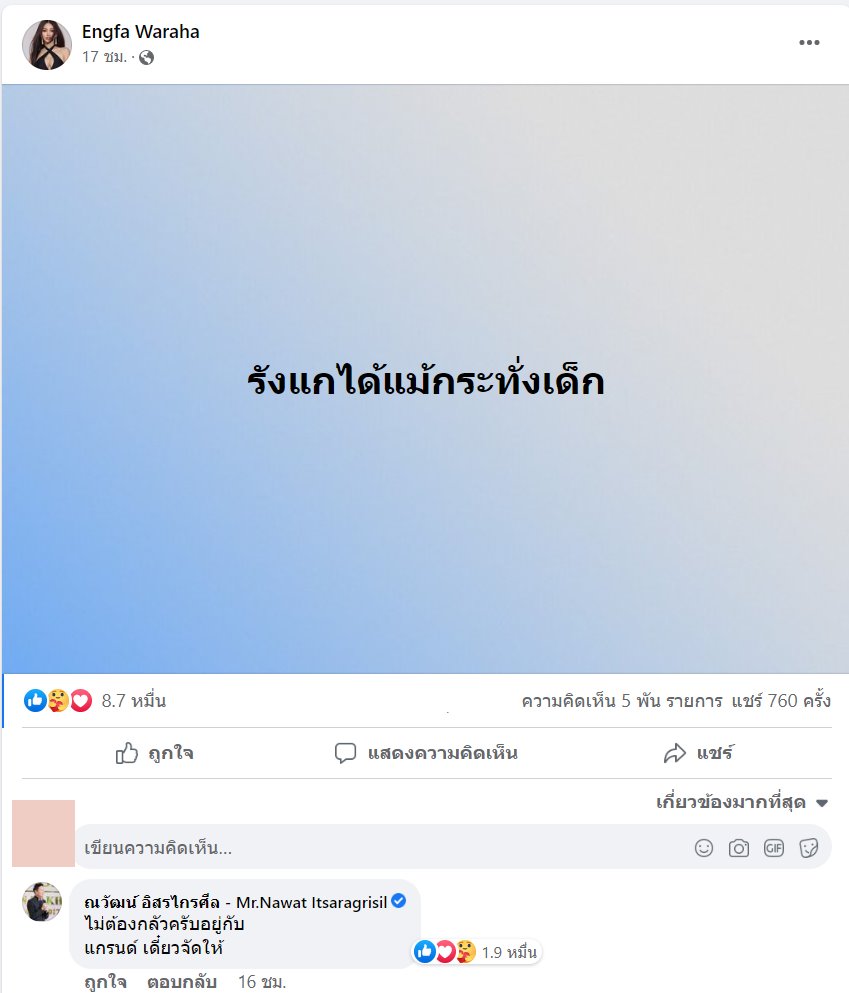- หลังจากค่ายเพลงออกประกาศดังกล่าว อิงฟ้า ก็โพสต์ข้อความสั้น ๆ ลงเฟซบุ๊กว่า "รังแกได้แม้กระทั่งเด็ก" ก่อนที่ทาง บอสณวัฒน์ อิสรไกรศีล บอสของเวทีมิสแกรนด์ จะเข้ามาคอมเมนต์ว่า "ไม่ต้องกลัวครับอยู่กับแกรนด์ เดี๋ยวจัดให้"