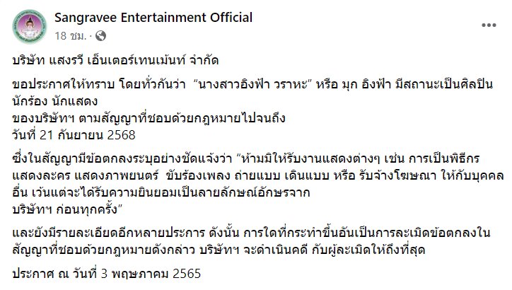 - หลังจากที่อิงฟ้าสัมภาษณ์ ทาง บริษัท แสงรวี เอ็นเตอร์เทนเม้นท์ จำกัด ได้ออกมาโพสต์ประกาศผ่านเฟซบุ๊ก หลังจากที่ไม่ได้อัปเดตมานาน 3 ปีกว่า ระบุว่า อิงฟ้า ยังมีสถานะเป็นศิลปิน นักร้อง นักแสดงของบริษัท ตามสัญญาไปจนถึงวันที่ 21 กันยายน 2568 ซึ่งห้ามไม่ให้รับงานแสดงต่าง ๆ ให้กับบุคคลอื่น เว้นแต่จะได้รับความยินยอมเป็นลายลักษณ์อักษรจากบริษัทก่อน หากมีการละเมิดสัญญา บริษัทจะดำเนินคดีให้ถึงที่สุด