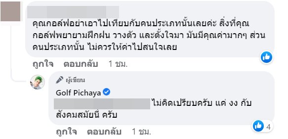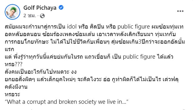 ล่าสุด (5 พฤษภาคม 2565) กอล์ฟ พิชญะ ศิลปิน นักแสดงชื่อดัง ก็ได้ออกมาโพสต์ข้อความลงในเฟซบุ๊ก ซึ่งคาดว่าสื่อถึงประเด็นดังกล่าว ระบุว่า