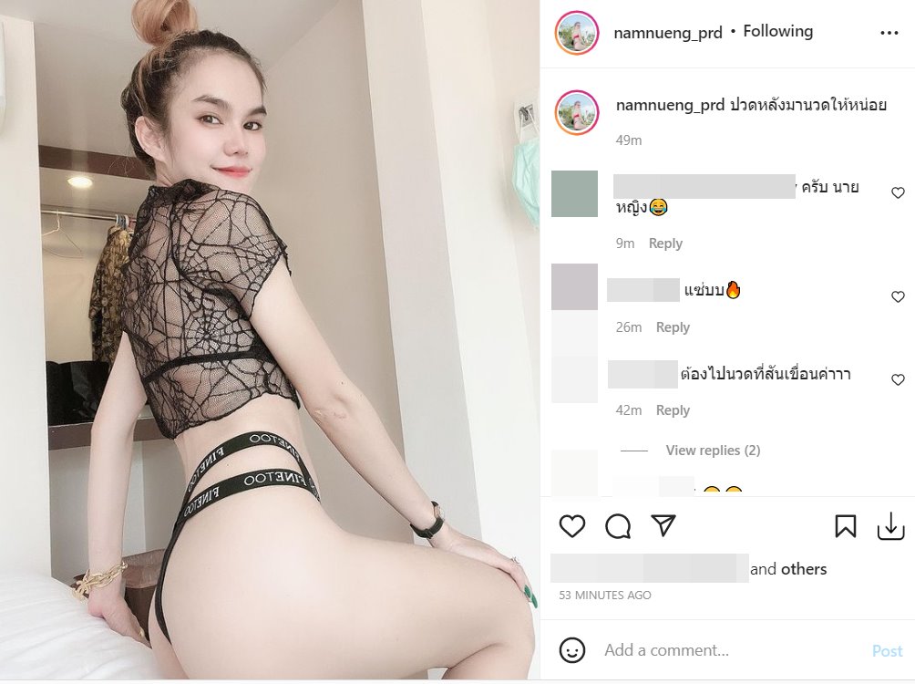 ล่าสุด (6 พฤษภาคม 2565) แม่น้ำหนึ่ง ก็ออกมาสาดความร้อนแรงจน IG แทบลุกเป็นไฟอีกครั้ง กับแฟชั่นบิกินี่สีดำ โชว์บั้นท้ายขาวเนียนแบบเต็ม ๆ ตา ส่วนท่อนบนสวมเสื้อครอปซีทรู ดูน่าค้นหาเข้าไปใหญ่ แถมมีแคปชั่นเด็ดแบบยั่ว ๆ ว่า "ปวดหลังมานวดให้หน่อย"