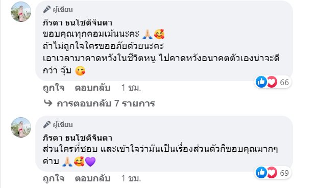 ขณะเดียวกันในเฟซบุ๊กของ แม่น้ำหนึ่ง ที่ลงภาพนี้เช่นกัน เจ้าตัวก็คอมเมนต์แบบฟาด ๆ ฝากถึงคนที่มาแขวะตนเองว่า “ขอบคุณทุกคอมเมนต์นะคะ ถ้าไม่ถูกใจใครขออภัยด้วยนะคะ เอาเวลามาคาดหวังในชีวิตหนู ไปคาดหวังอนาคตตัวเองน่าจะดีกว่า จุ้บ”