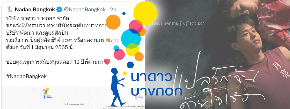 เล่นเอาแฟน ๆ ช็อกกันไปเลยทีเดียว ที่ล่าสุด (10 พฤษภาคม 2565) นาดาว บางกอก บริษัทดูแลศิลปินดาราที่ปั้นดาราจนดังหลายคน และผลิตผลงาน ละคร ซีรีส์ เพลง ฮิต ๆ ออกมาเพียบ ได้โพสต์ประกาศยุติบทบาทต่าง ๆ ของบริษัทผ่านทุกสื่อโซเชียล