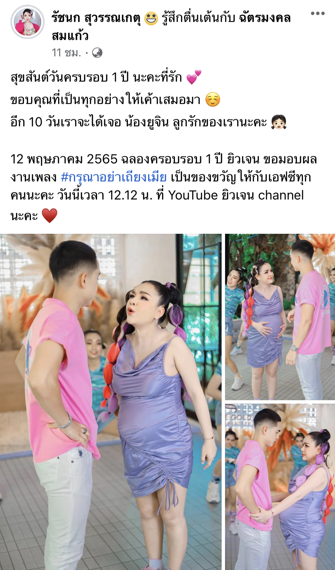 “สุขสันต์วันครบรอบ 1 ปี นะคะที่รัก ขอบคุณที่เป็นทุกอย่างให้เขาเสมอมา อีก 10 วัน เราจะได้เจอน้องยูจิน ลูกรักของเรานะคะ 12 พฤษภาคม 2565 ฉลองครบรอบ 1 ปี ยิวเจน ขอมอบผลงานเพลง #กรุณาอย่าเถียงเมีย เป็นของขวัญให้กับเอฟซีทุกคนนะคะ วันนี้เวลา 12.12 น. ที่ YouTube ยิวเจน channel นะคะ”