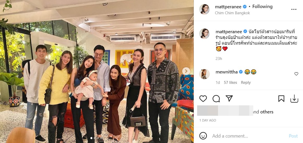 งานนี้สาว แมท ภีรนีย์ ที่มาพร้อมแฟนหนุ่ม สงกรานต์ เตชะณรงค์ ก็โพสต์ภาพหมู่ของการรวมตัวกันครั้งนี้ พร้อมเผยว่า "นัดโชว์ตัวสาวน้อยมารินที่ร้านลุงนัยป้าแต้วค่ะ แต่งตัวสวยมาให้น้า ๆ ถ่ายรูป ตอนนี้โทรศัพท์น้าแต่ละคนเมมเต็มแล้วค่ะ"