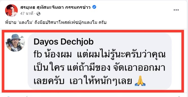 เฟซบุ๊ก สรยุทธ สุทัศนะจินดา กรรมกรข่าว ได้เผยแพร่ข้อความจากเฟซบุ๊กของ ต่อย ดายศ พี่ชายของ แตงโม นิดา ฝากถึงมือปริศนาที่โพสต์เฟซบุ๊กของน้องสาวว่า
