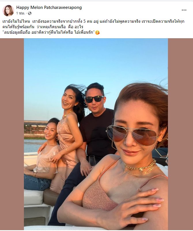 กลายเป็นที่จับตามองอีกครั้ง กรณีที่เฟซบุ๊กของ แตงโม นิดา ดาราสาวผู้ล่วงลับ ได้กลับมามีการเคลื่อนไหว โดยโพสต์ภาพด้านหลังที่ดูคล้าย กระติก ผู้จัดการของแตงโม พร้อมข้อความว่า "หนูถูกทำร้ายจากเพื่อนที่เรารักแล้วไว้ใจ" และโพสต์ภาพเซลฟี่ของแตงโมกับคนบนเรือ บอกว่า "เรายังไม่ไปไหน เรายังรอความจริงจากปากทั้ง 5 คน อยู่ แต่ถ้ายังไม่พูดความจริง เราจะเปิดความจริงให้ทุกคนได้รับรู้พร้อมกัน ว่าเหตุเกิดบนเรือ คือ อะไร ลบข้อมูลมือถือ อย่าคิดว่ากู้คืนไม่ได้หรือ ไอ้เพื่อนรัก"